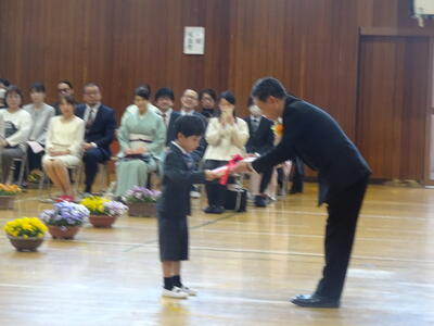 緊張した面持ちで自分の教室へと入り、自分の机に座る、ロッカーにランドセルをしまうなど、たくさんの「初めて」を経験しました。式中も話をする人へ目を向け、じっと聞く姿が立派で、新入生としての自覚を感じました。