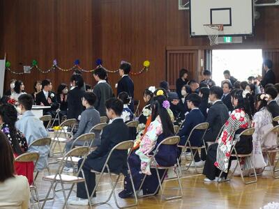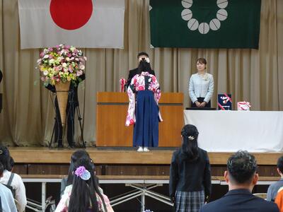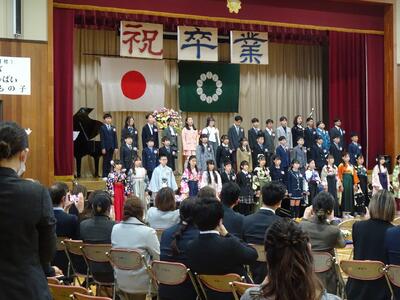 式では、卒業証書授与において、一人一人がしっかりと前を向き、堂々とした姿で証書を受け取る様子が印象的でした。これまでの学校生活で積み重ねてきた努力や成長が感じられる、立派な姿でした。